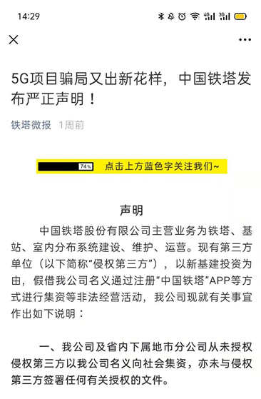 中国铁塔官方微信则在近日再度发布声明,“公司及省内下属地市分公司从未授权侵权第三方以我公司名义向社会集资,请各单位和广大群众审慎对待,严格核查相关证明文件,必要时可直接向当地公安机关报案。”