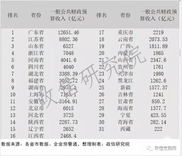 表二:2019年31省市自治区一般公共财政预算收入一览(数据截止2019-12-31)