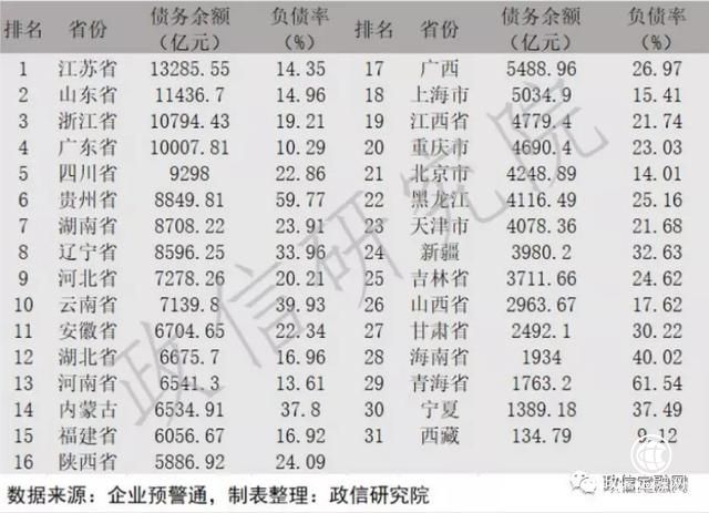 三、31个省市自治区政府债务余额排行榜及负债率一览