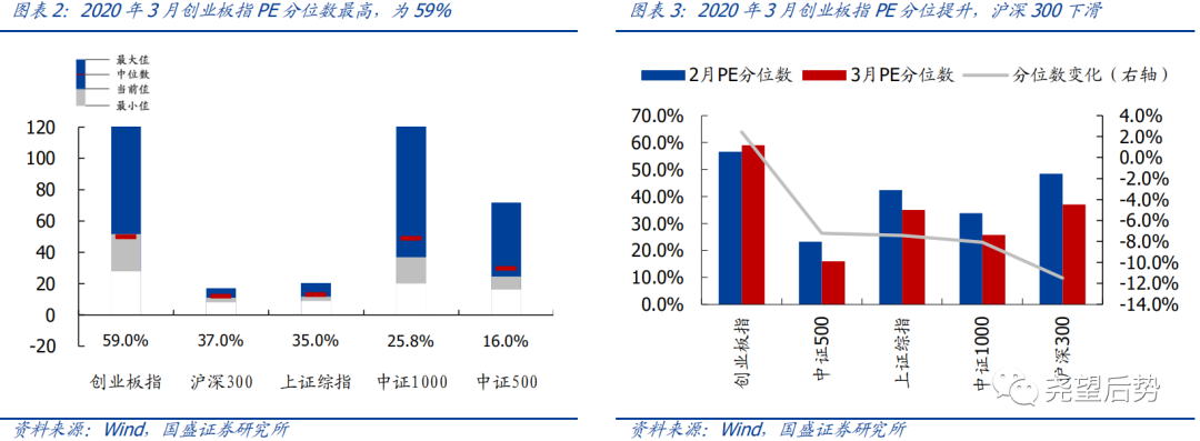 截至2020年3月底,创业板指、沪深300、上证综指、中证1000及中证500的PE(TTM)分别为51.67、11.00、11.70、36.88和24.54;其中创业板指估值分位较高,为59.0%;其余指数估值均在中位数以下中证500估值分位较低,为16.0%。