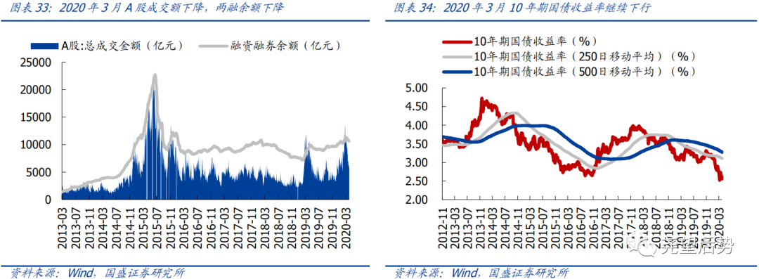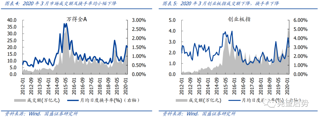 2020年3月,市场成交额及换手率均有所下降。具体来看,万得全A成交额由上月的19.5万亿元小幅下降至19万亿元,日均换手率由上月的1.59%小幅下降至1.48%;创业板指成交额由上月的4.3万亿元下降至3.8万亿元,日均换手率由上月的4.05%下降至3.05%。