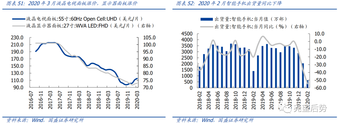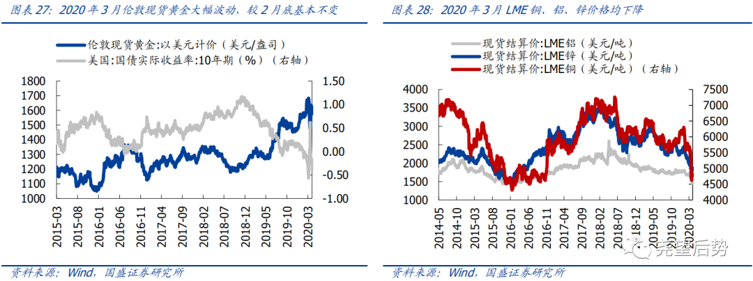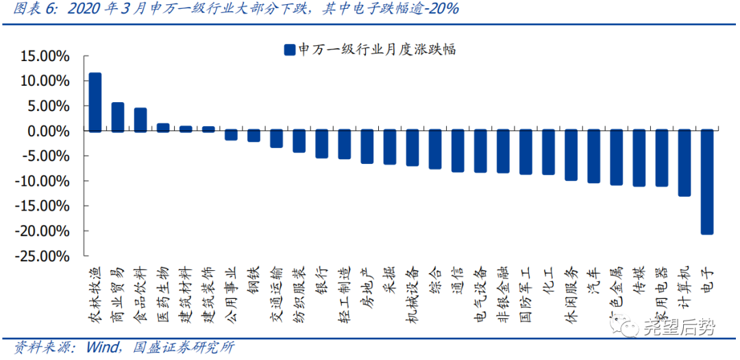 2020年3月,28个申万一级行业中仅6个上涨,农林牧渔(11.3%)、商业贸易(5.38%)、食品饮料(4.26%)、医药生物(1.18%)及建筑材料(0.63%)涨幅居前;电子(-20.44%)、计算机(-12.81%)、家用电器(-10.85%)、传媒(-10.83%)及有色金属(-10.55%)跌幅较大。
