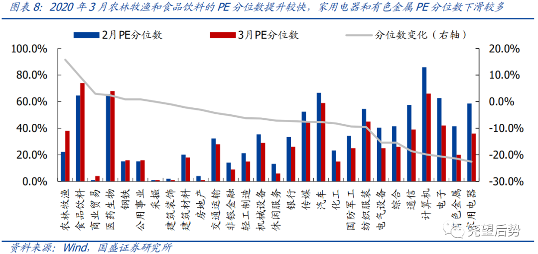 从PE分位数的变化来看,28个行业中有6个行业估值分位数较上月有所提升,农林牧渔、食品饮料、商业贸易、医药生物及钢铁的PE分位提升较快;家用电器、有色金属、电子、计算机及通信的PE分位下滑较多。