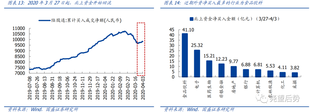 海外恐慌情绪缓解,北上资金开始回流。作为影响消费板块最重要的资金——海外资金,在前期全球动荡的背景下大幅流出,近期随着海外市场恐慌情绪的缓解,3月底北上资金开始回流,从近期外资净买入行业分布来看,食品饮料居首位,净买入达到41.1亿元。