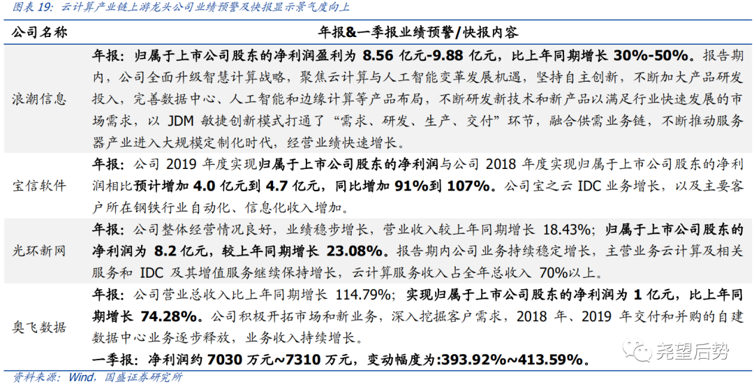 疫情刺激云计算产业链景气度爆发。未来随着5G网络建设加速,5G下游应用将带动流量爆发,拉动云计算需求增长。而受近期疫情影响,更是使得云办公等需求激增,云计算产业链景气度有望爆发,特别是上游的括服务器、IDC等,近期部分龙头公司的年报及一季报业绩预告/快报也显示了行业景气的改善。