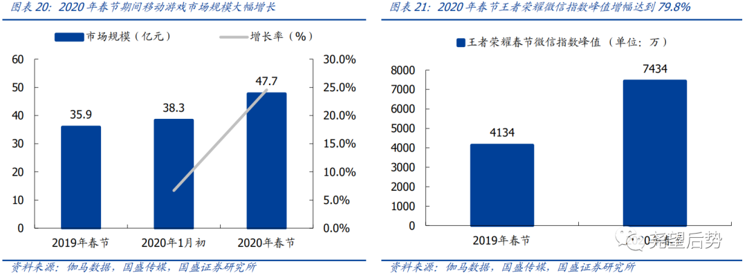 疫情带动线上游戏活跃度大幅提升。一季度受疫情的影响,居家隔离使得用户将更多的娱乐时间转向线上,游戏业务板块活跃用户大幅增加,流水也有较大提升。数据显示,2019年春节、2020年1月初和2020年春节移动游戏市场规模分别为35.9亿元、38.3亿元和47.7亿元,2020年1月初较2019年春节增长6.69%,2020年春节较2020年1月初增长24.54%。作为春节期间流水第一高的游戏王者荣耀,2020年春节微信指数峰值增长了79.8%。