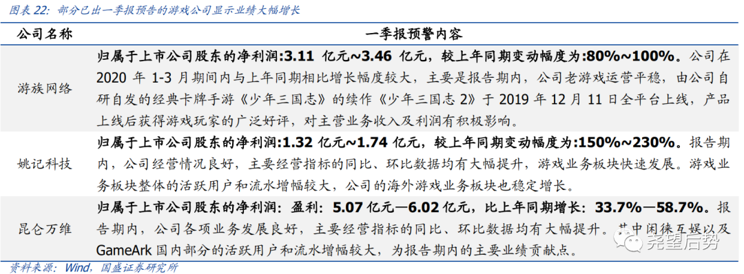 一季报业绩预告数据亮眼。当前部分游戏公司一季度业绩预告已经公布,游族网络(19.480, -0.22, -1.12%)净利润同比增速在80%-100%之间,姚记科技(27.850, -1.65, -5.59%)净利润同比增速在150%-230%之间,昆仑万维(18.010, -0.59, -3.17%)净利润同比增速在33.7%-58.7%之间,侧面验证了游戏板块的高景气。