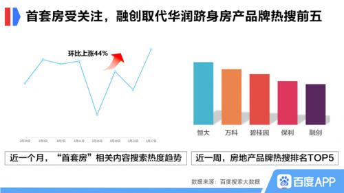 此外,在房地产、汽车等低频、高客单价的消费场景中,消费者的需求也被迅速激活。搜索大数据显示,近一个月," 首套房首付比例 "、" 首套房贷款利率 " 等首套房相关内容搜索热度上涨 44%,恒大依旧是人们最为关心的房地产品牌,融创则取代华润,跻身热搜前五。