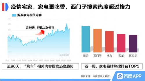 同时,人们宅家期间,平时忽视的家电再次受到重视,近 90 天来搜索 " 购买家电 " 相关内容一路攀升," 电视机多大尺寸好 "、" 智能电视 " 等成为人们热搜,品牌排名上,美的搜索热度稳居第一,西门子则超过格力,排名第二。