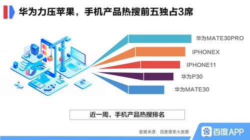 在手机市场,华为力压苹果,华为 MATE30PRO 搜索热度超过 iPhone x, 前五之中独占 3 席。而从新品的搜索数据来看,华为 P40 搜索整体日均值同样超过 iPhone9,热度环比上涨 320%。