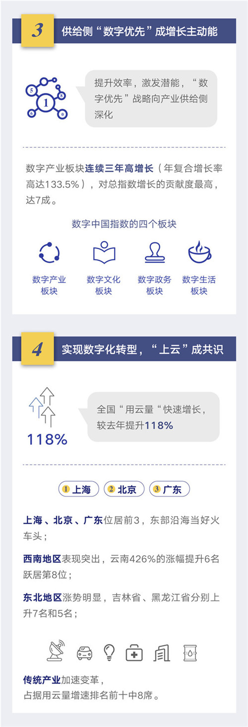 此次发布的报告显示:2019年数字中国指数继续保持高速增长,其中,以珠三角、京津冀和长三角为代表的11大城市群是推动我国数字化进程的中坚力量。此外,2019年全国用云量实现了118%的增长,2020年上半年各月份的用云量均明显高于去年同期,并且传统产业增速尤为明显。