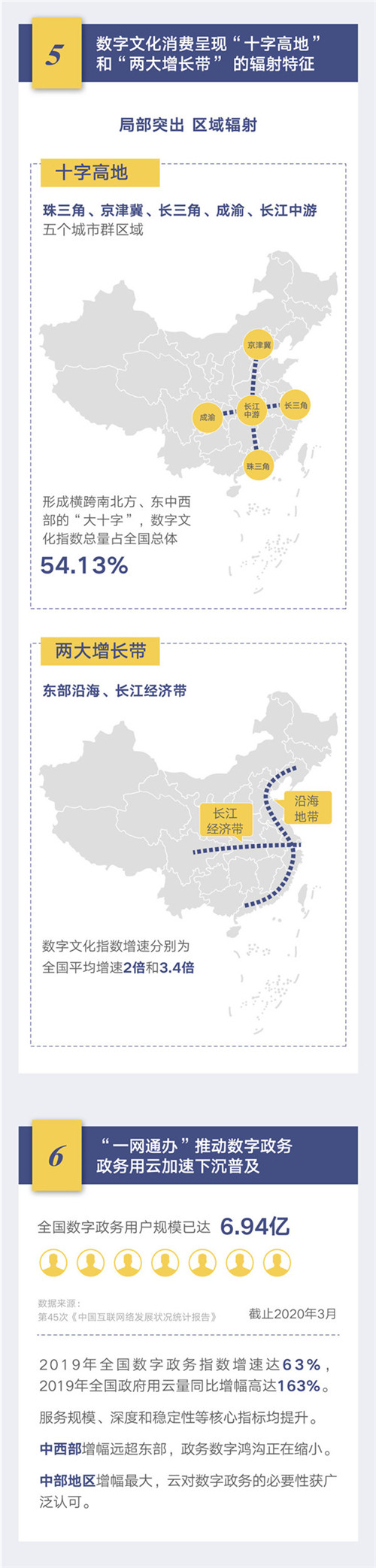 地理分布上来看,长三角、珠三角,京津冀,长江中游、成渝等五个城市群已经形成了数字文化指数的发展高地。他们在地图构成了横跨南北东中西部的“大十字高地”。