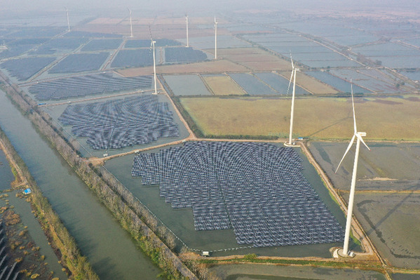 图为江苏省扬州市宝应县射阳湖镇15万千伏安“风光渔”互补产业发电项目。新华社记者 李博 摄