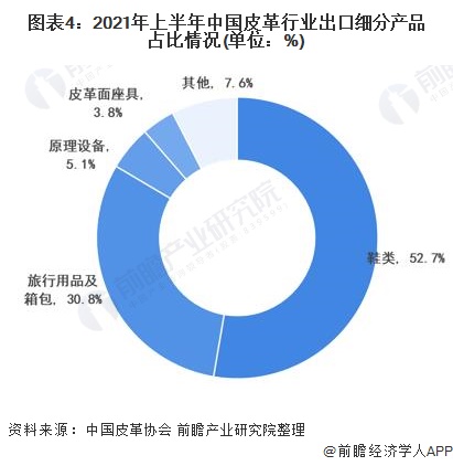 从出口市场的细分产品结构来看,2021年上半年,我国鞋类产品出口41.0亿双,出口金额为203.6亿美元,占全国皮革行业整体出口规模的52.7%;旅行用品及箱包出口49.0亿只,出口金额为119.0亿美元,占全国皮革行业整体出口规模的30.8%。皮革行业出口市场仍然是以鞋类和旅行用品及箱包产品为主,两者出口金额规模占比超过80%。
