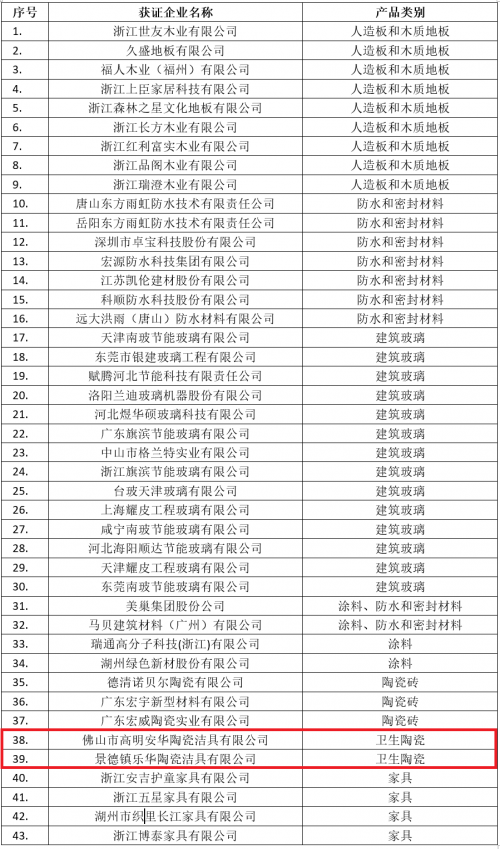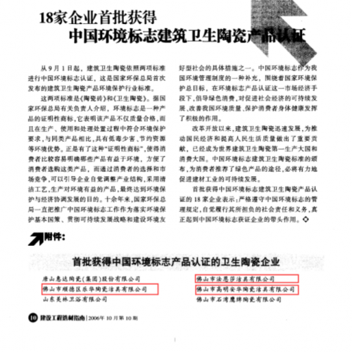 *2006年,18家企业首批获得中国环境标志建筑卫生陶瓷产品认证,其中箭牌家居集团包揽3个名额