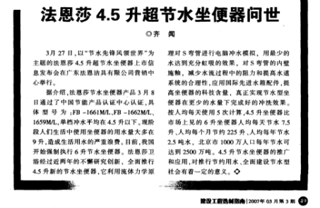 *2007年,法恩莎4.5升超节水座便器问世,远远达超国家节水产品6升的标准