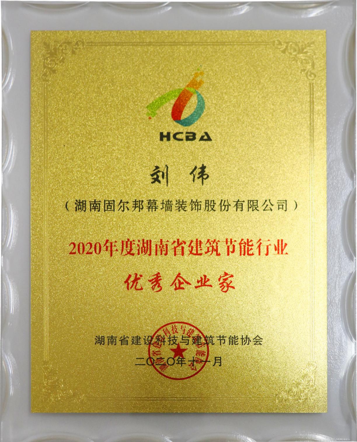 12月10日,“2020年湖湘建设绿色尖峰榜”正式颁布,湖南固尔邦幕墙装饰股份有限公司在优秀企业、优秀企业家、先进工作者三大类中均荣登金榜,其中,固尔邦董事长刘伟获得“2020年湖南省建筑节能行业优秀企业家”奖项。