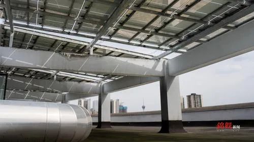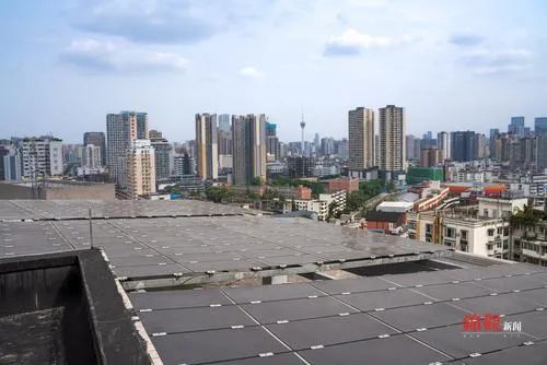 在大楼管理运营方的带领下,记者首先来到了楼顶。推开天台房门,忽然被一阵明亮的光线晃得直眨眼睛。屋顶上,一大片排列整齐的太阳能光伏板像平整的镜子,在“吸吮”着阳光。