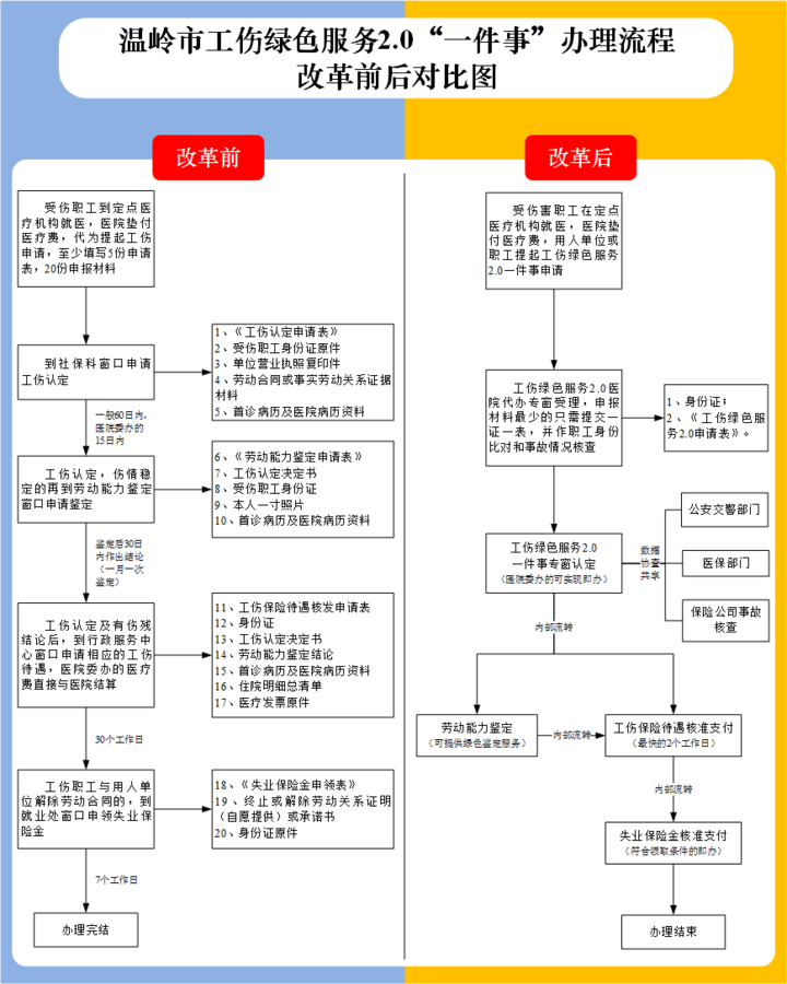 为深入践行“最多跑一次”改革,今年,市人社局创优升级,推出更便民的工伤绿色服务2.0“一件事”,将企业职工工伤涉及的一系列事项整合,实现“一窗、一表、一申请、一平台”的“一件事”办理,材料精简率最高达92.8%,时限缩减最多达98.4%,让工伤事故企业和职工更省心。