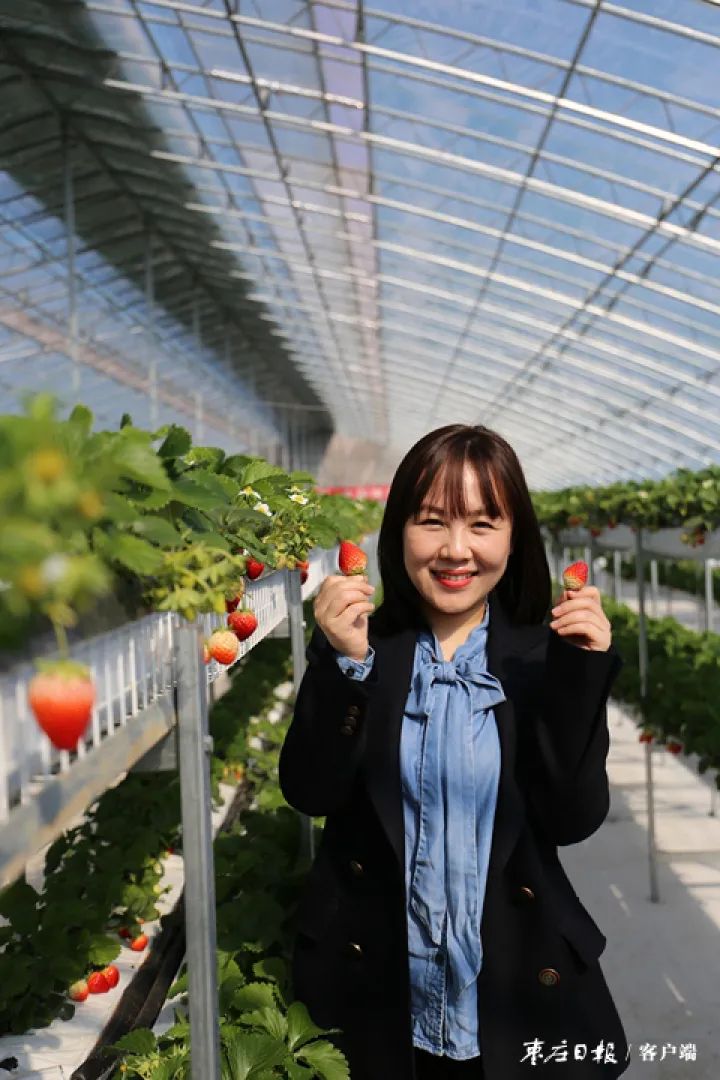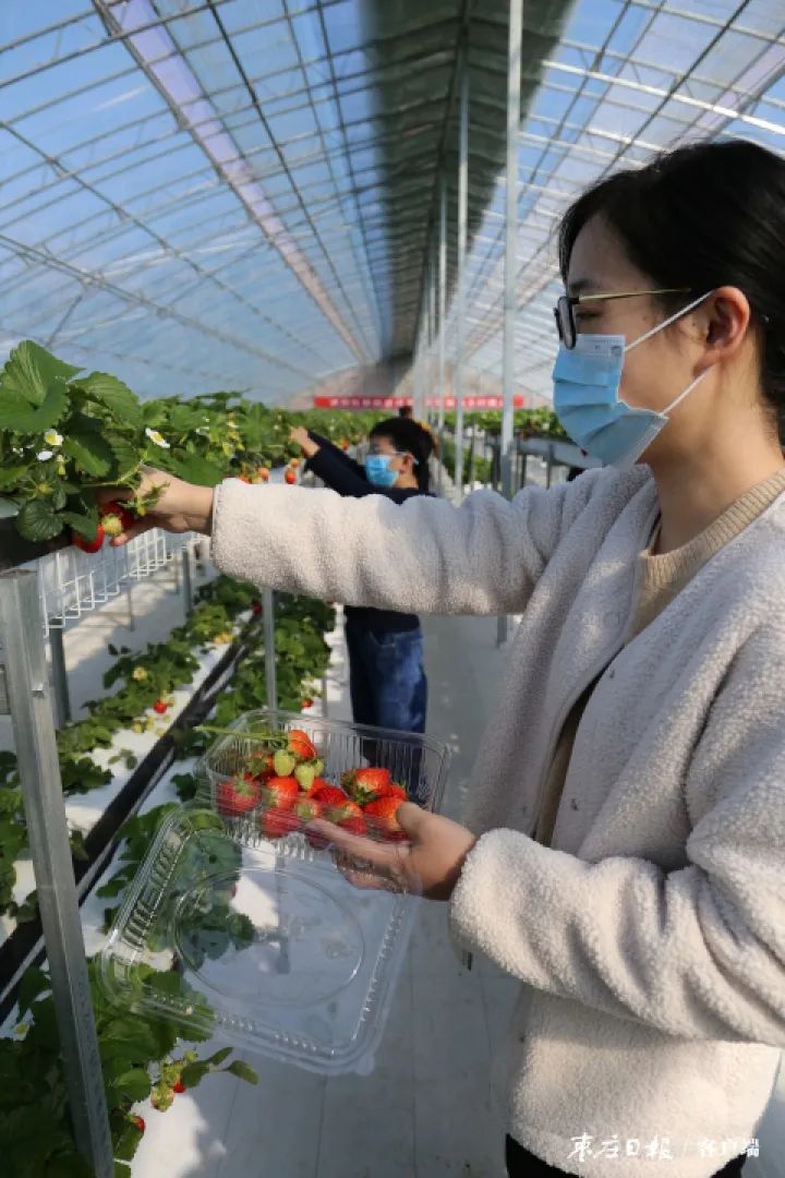 记者在草莓大棚内看到,营养液罐、消毒罐、回液消毒机伫立在棚内,管道有序相连,地膜干净整洁,两层种植的草莓,红艳艳的果实掩映在碧绿的叶子下,分外诱人。来自薛城区领秀城小区的居民董雪正带着孩子,在棚内高兴地采摘。