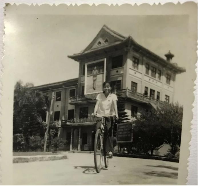 1969年,佛山市民骑单车留影于西樵山白云洞风景区,当时能有一辆28寸双通凤凰牌单车,相当难得。(来源:唐泳茵供图)