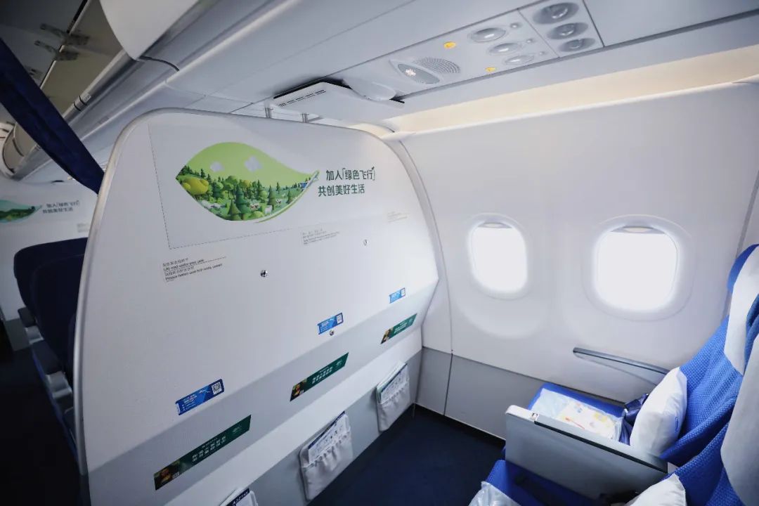 “欢迎您乘坐南航‘绿色飞行’主题航班。今天是第52个世界地球日,也是南航第4届社会责任日……”进入客舱后,大家纷纷被眼前的一片“绿意”所吸引——此次航班的客舱内装扮一新,隔板贴有“加入绿色飞行 共创美好生活”等装饰,让所有旅客步入客舱就感受到浓浓的“绿色”气息。