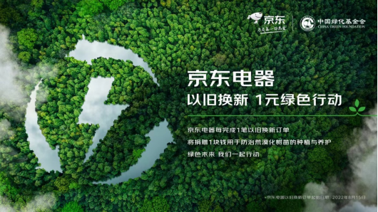 为汇聚更多环保力量,践行企业社会责任,京东宣布联合中国绿化基金会开展“以旧换新1元绿色行动”公益项目,消费者在京东每完成1笔电器产品以旧换新订单,京东都将捐赠1块钱用于公益植树,和消费者一起共建绿色未来。