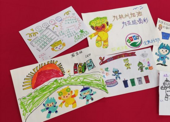 孩子们用手中的画笔将“绿色亚运”与自己日常生活中学到的垃圾分类知识相结合,充分发挥想象力,描绘出一幅幅充满童趣、绿色的绘画作品。
