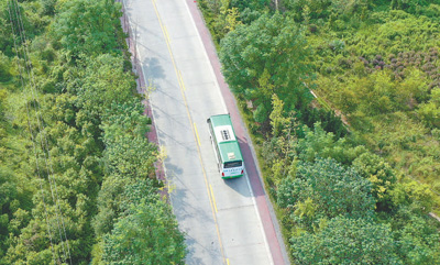 湖南省永州市道县倡导低碳绿色出行,为旅游资源丰富的贵头村、两河口村等村开通纯电动公交车,方便村民和游客。图为纯电动公交车行驶在道县梅花镇贵头村村口道路上。