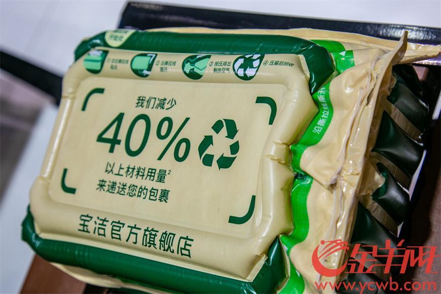 宝洁带来的创新电商包装 " 空气胶囊 "。它由 100% 单一材料制成,无需额外纸箱和胶带,对比传统包装节省 50% 以上材料重量