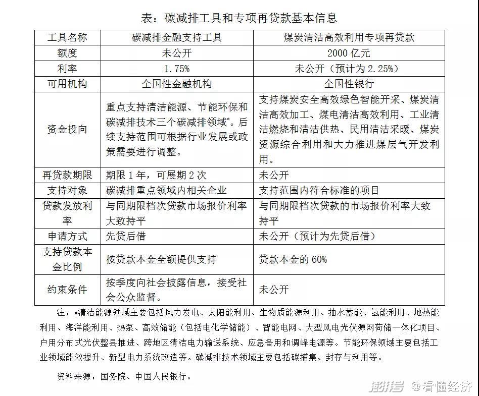 不同之处在于支持的方向不同,专项再贷款支持煤炭清洁高效利用,总体还是增加了碳排放的(碳减排工具则是支持具有明显减排效能的领域);虽然暂未有更多信息,但该专项再贷款利率大概率与支农支小再贷款利率相同(2.25%,碳减排工具为1.75%),且人民银行按贷款本金全额提供支持(碳减排支持本金的60%)。这两项工具的基本情况汇总如下: