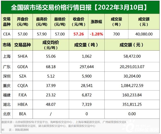 3月10日全国碳市场碳排放配额(CEA)挂牌协议交易成交量700吨,成交额40,080.00元,开盘价57.00元/吨,最高价57.90元/吨,最低价57.00元/吨,收盘价57.26元/吨,收盘价较前一日下跌1.28%。今日无大宗协议交易。今日全国碳排放配额(CEA)总成交量700吨,总成交额40,080.00元。