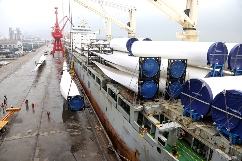 2月28日,一艘货轮在江苏连云港港东方公司码头装载风力发电设备。新华社发(王春 摄)