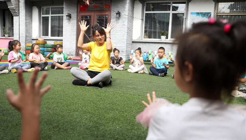 幼教老师在辽宁省凤城市大梨树村萌芽幼儿园里带领孩子们游戏(2020年9月9日摄)。新华社记者 姚剑锋 摄