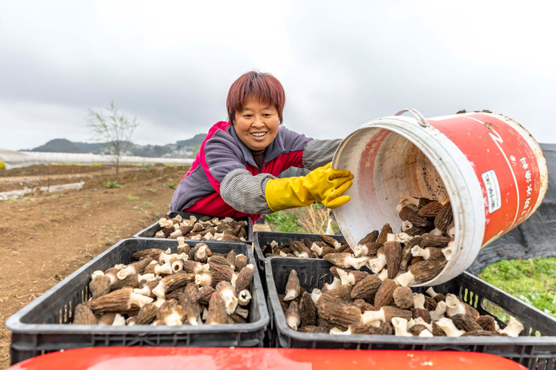 2月27日,村民在贵州省毕节市黔西县甘棠镇大寨村羊肚菌种植基地装运羊肚菌。为巩固脱贫成效,甘棠镇采取“社社联建”的发展模式发展羊肚菌种植,既解决群众就近务工,又带动农户增收。新华社发(范晖 摄)