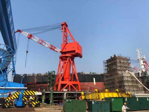 船台上,一台橙红色的门坐式起重机正在执行吊运作业。(邢郑 摄)