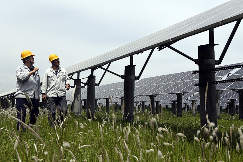 5月14日,在滨州市沾化区富源街道的华能沾化清风湖风光同场项目区,工人们进行光伏电站的日常巡检。