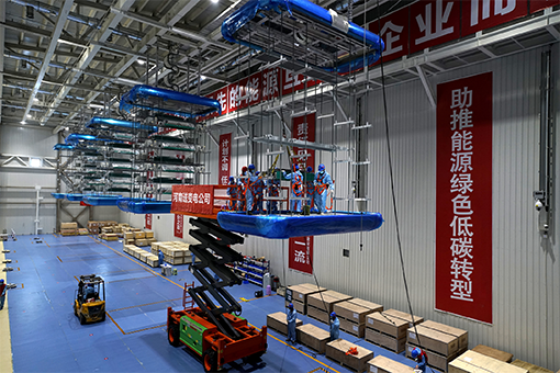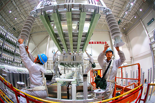 国网冀北电力员工在张北柔直工程换流站阀厅开展设备调试。