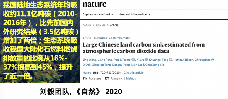 近期,大气所刘毅团队在《自然》上发表的一篇文章,就采用了这种大气观测评估方法,得出我国陆地生态系统年均吸收二氧化碳大概是11亿吨,而国外研究结果远低于11亿吨。