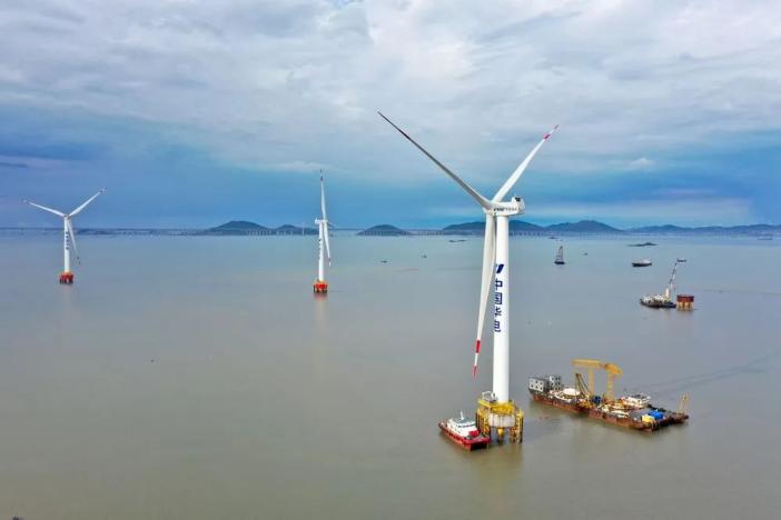 这是华电福清海坛海峡海上风电项目首台海上风电主控系统国产化机组(右)(5月28日摄,无人机照片)。新华社记者 姜克红 摄