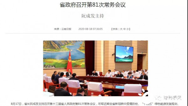 星期一-8月17日:云南省省长阮成发主持召开第十三届省人民政府第81次常务会议,听取近期包括“十四五”绿色能源发展规划在内的有关工作情况汇报,对新能源发展提出了明确具体的要求。