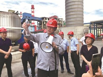 2020年8月25日,三聚环保在河南鹤壁举行生物能源产业基地扩能改造开车现场观摩会,三聚环保总经理李林向参会者介绍二代生物柴油生产情况。(李闻芝 摄)