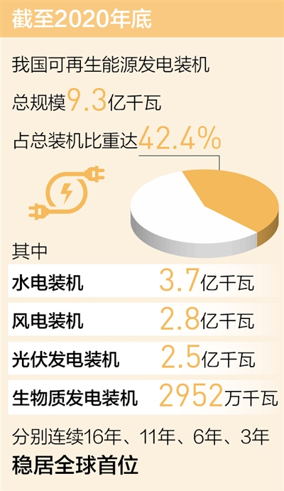 数据显示,截至2020年底,我国水电装机3.7亿千瓦、风电装机2.8亿千瓦、光伏发电装机2.5亿千瓦、生物质发电装机2952万千瓦,分别连续16年、11年、6年和3年稳居全球首位。目前,我国已形成较为完备的可再生能源技术产业体系。水电领域具备全球最大的百万千瓦水轮机组自主设计制造能力。低风速风电技术位居世界前列,国内风电装机90%以上采用国产风机。