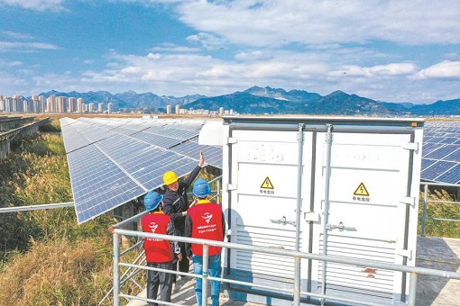 国网浙江温州供电公司员工在乐清正泰农光互补光伏电站巡检。