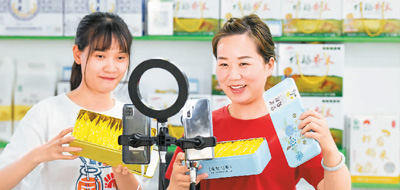 7月13日,在河北省邯郸市永年区工业园区冀南电商产业园,主播利用直播平台销售服装。 |