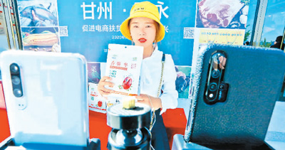 在甘肃张掖甘州区明永镇的田间地头,主播正向消费者推广特产“金丝小枣脆枣片”。 |