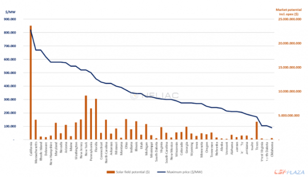 如果工业用热需求的分布类似于美国的人口分布,并且如果将120?C-220?C的工业用热需求的30-40%,通过太阳能与压力储水关相结合来满足,那么我们将有290,000MW的市场机会。