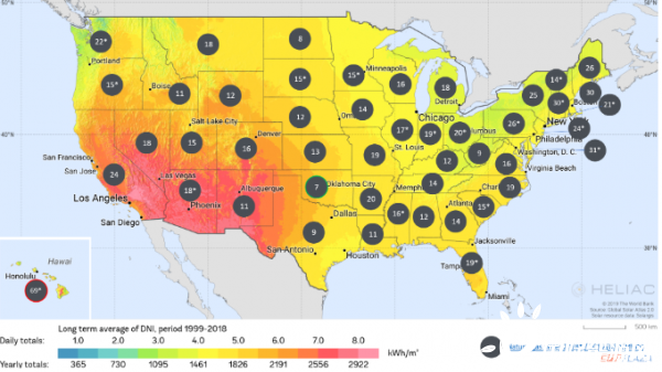 图:美国2018*/2019年工业天然气价格,以及1999-2018年的平均DNI