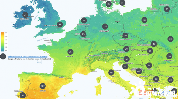 图:欧洲2018*/2019年大型承购人的工业天然气净价格,结合平均DNI图