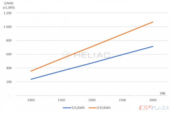 在此温度水平下白天/夜间存储应可满足行业需求的30-40%。覆盖范围取决于光照资源的多少(表示为DNI)。假设DNI<1600,则可满足30%行业需求,DNI在1600-2000之间,则可以满足35%的行业需求,若DNI>2000,则可以满足40%。